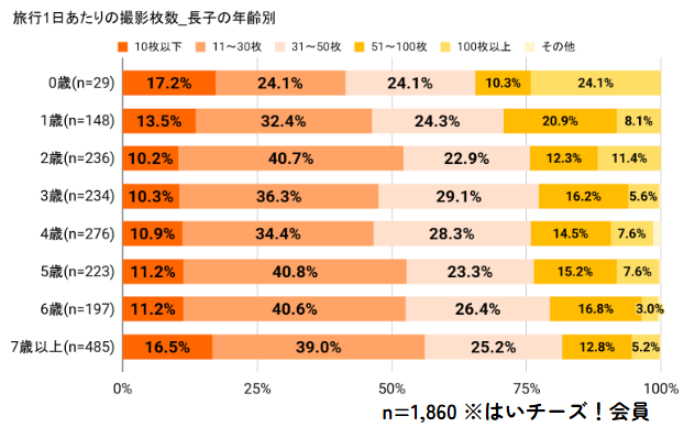 旅行1日当たりの撮影枚数(※)の質問から未就学児保護者の旅行中の写真撮影が活発であることが明らかとなりました。1日あたり「11~30枚」が最も多く約40%。次いで「31~50枚」が25%となりました。長子の年齢別でみると、年齢があがるほど撮影枚数は減少するとうかがえます。