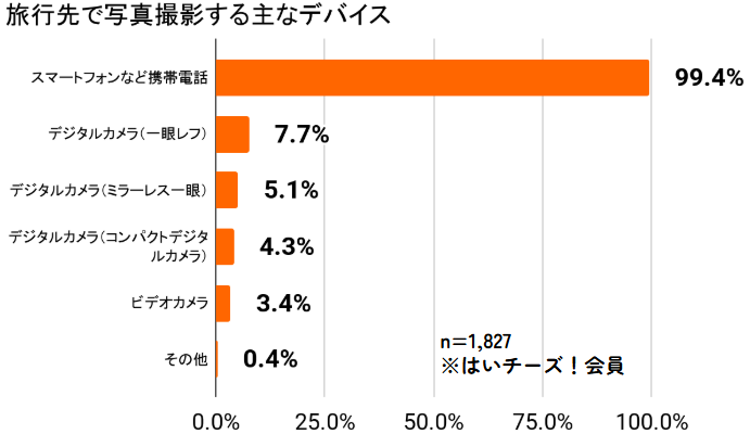 デジカメ・一眼レフなどの専用機器はごく少数にとどまり、スマートフォンが99.4%と圧倒的多数に。スマホの高性能化やSNS投稿の手軽さも背景にあり、日常的な子どもの記録手段としてスマートフォンが完全に定着していることがうかがえます。