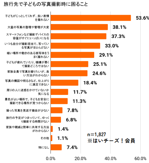 旅行先での子ども撮影における悩みは、「子どもがじっとしてくれず、良い表情を撮れない(53.6%)」が最も多く挙げられ、全体の半数以上が子ども自身の動きや表情コントロールに苦労していることが明らかとなりました。