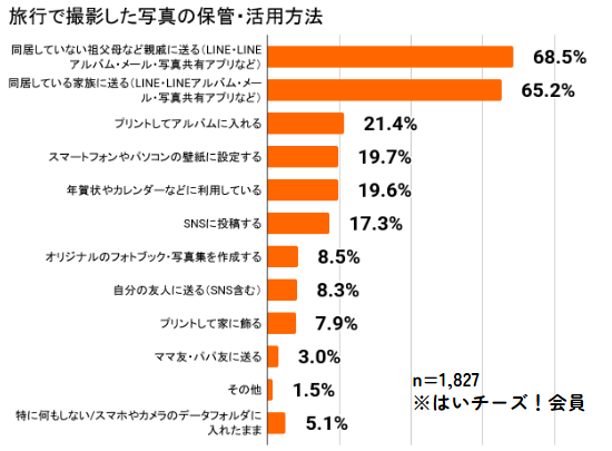 撮影後の写真活用では「同居していない祖父母など親戚に送る(68.5%)」と「同居している家族に送る(65.2%)」といった家族間の共有用途が主流。一方で「プリントしてアルバムに入れる」「年賀状に利用」など紙での出力と、「スマホ壁紙設定」「SNS投稿」のデジタル記録や発信は20%前後を占め、保管・活用方法の多様化が進んでいる様子です。