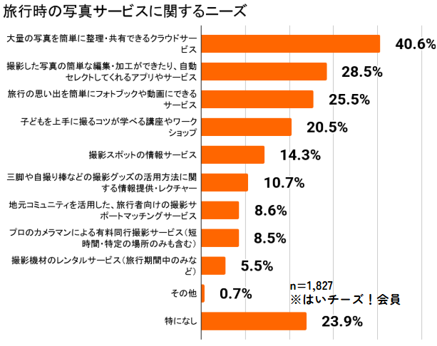 加えて「撮影後の編集・加工」「フォトブック・動画化」なども上位に挙がっており「撮る」から「加工する・楽しむ」までをトータルでサポートしてくれるサービスが望まれていることがうかがえます。