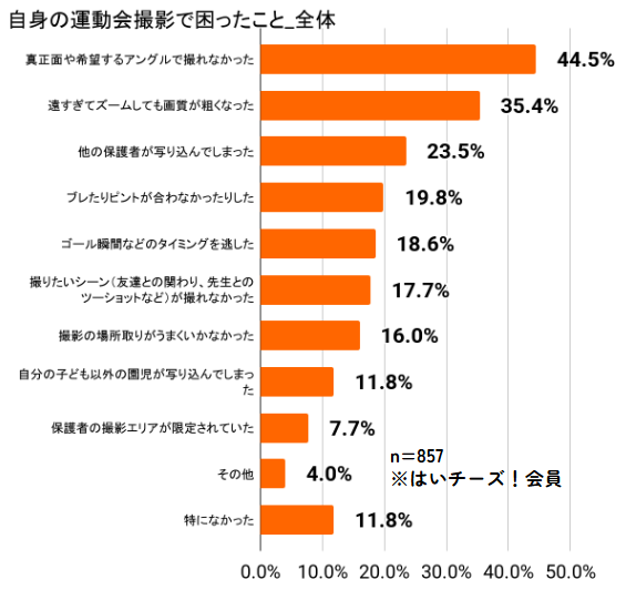 保護者自身の運動会撮影で困ったことは「真正面や希望するアングルで撮れなかった」(44.5%)が最多となり、観覧場所の制約による撮影アングルの問題があったことが伺えます。