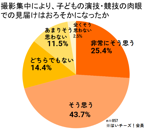 また、97.5%の保護者が自身で写真や動画を撮影する中、約7割(69.1%)(非常にそう思う:25.4%+そう思う:43.7%)の保護者が、撮影に集中することで「子どもの演技・競技を肉眼で見届けることがおろそかになった」と感じています。