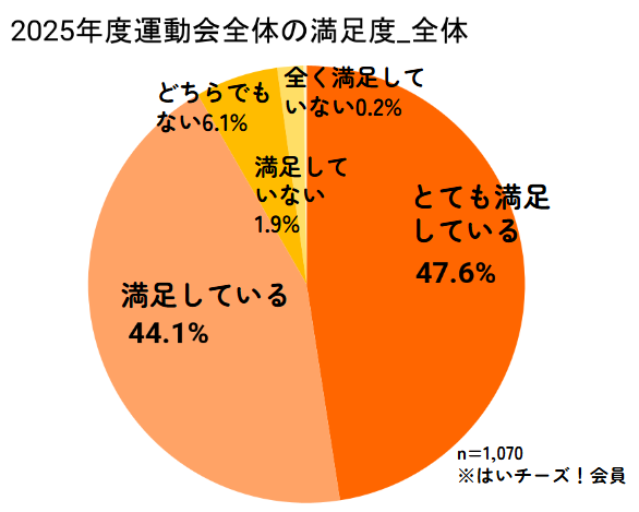 保護者の運動会に対する「とても満足している」(44.1%)または「満足している」(47.6%)の合計は91.7%と非常に高く、運動会そのものへの評価は高水準でした。