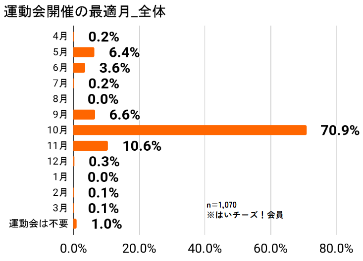 また、保護者が考える運動会開催の最適月は「10月」が70.9%と圧倒的多数を占めており、猛暑を避け、気候の良い時期の開催が強く望まれていることが分かりました。