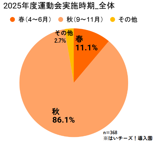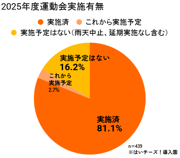 2025年度の運動会は、調査時点(11月中旬)で全体の81.1%が実施済みであり、実施時期は「秋(9〜11月)」が86.1%と主流。