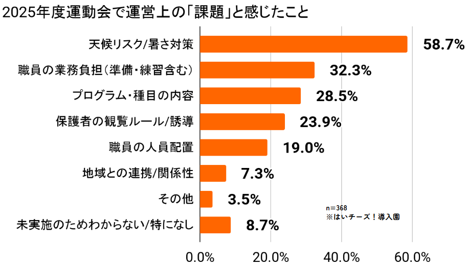 園が運営上の「課題」と感じたことでは、「天候リスク/暑さ対策」が58.7%と突出して多く、約6割の園が直面している重要なの課題であることが分かります。次いで「職員の業務負担(準備・練習含む)(32.3%)」が続き、気候変動への対応と職員の負担軽減が喫緊の課題であることが分かります。
