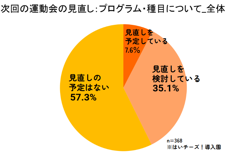 次回運動会で最も見直し意向が高い項目は「プログラム・種目」で、42.7%(予定7.6%+検討35.1%)の園が予定・検討しています。
